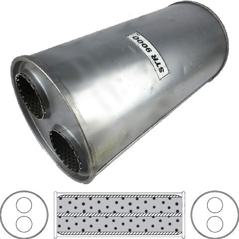Universal Muffler - Twin Application 175mm(7") Round, 400mm(16") Long, 2 x 063mm(2-1/2") In/Out, Centre Centre, No Spigots, Mega Power, Mild Steel