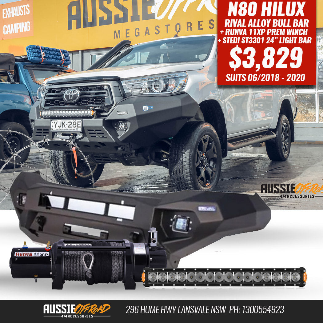 HILUX N80 REVO Rival Alloy Bull Bar + Runva Winch & Stedi Type X Sport Spotties