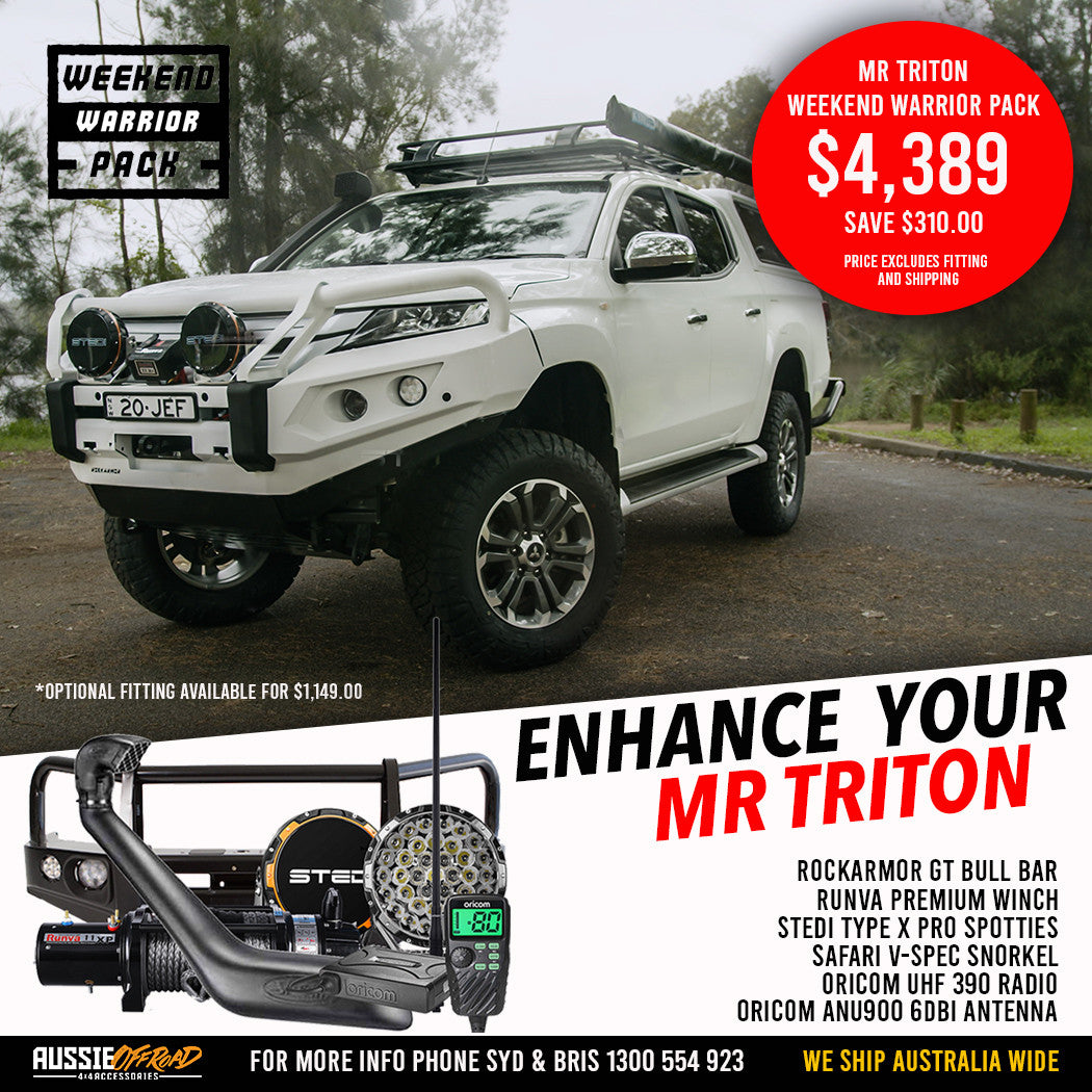 Exclusive to Aussie OffRoad, the Weekend Warrior Pack combines some of the best 4x4 Accessory brands, that will enhance your MR TRITON to go further! Once fitted, the weekend warrior Pack will provide your Triton's vital on & off-road protection, superior night vision, off road recovery assurance, the ability to drive through deep water crossings plus the capability to communicate with other 4x4 for any emergency services when needed.
