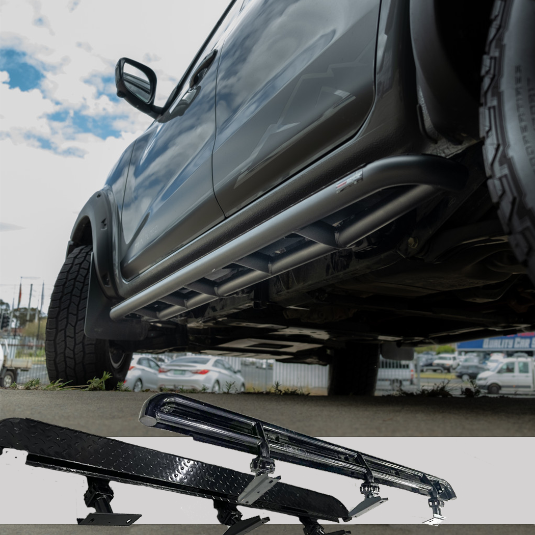 The steps, are pre - assembled with a steel checker plate, that provide you and your passengers with safe & easy access to the front & rear of your vehicle’s cabin.